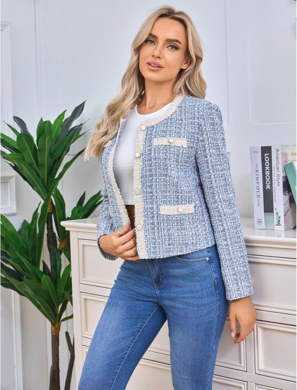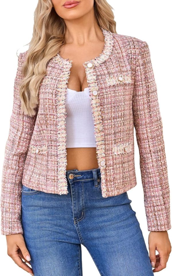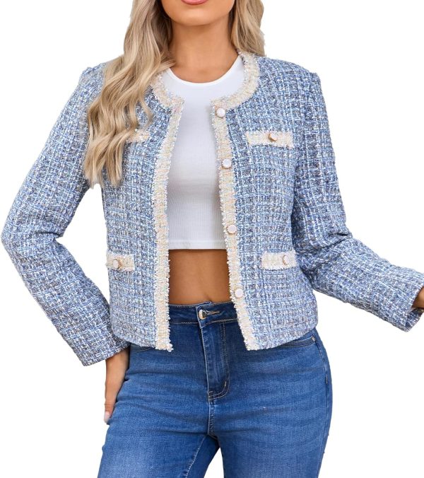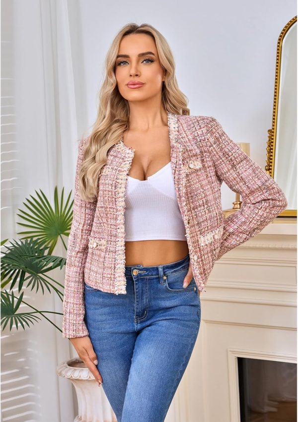 Tweed Blazer Jackets for Women Long Sleeve Elegant Office Work Business Casual Cropped Tweed Jacket